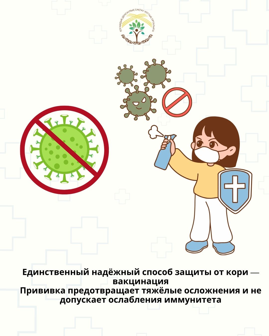 В Национальном календаре прививок предусмотрена вакцина против кори, краснухи и паротита. В Казахстане её обычно вводят ребёнку в возрасте 1 года, затем - в 6 лет. В условиях роста заболеваемости первая доза может быть введена уже в 9 месяцев для защиты младенцев.